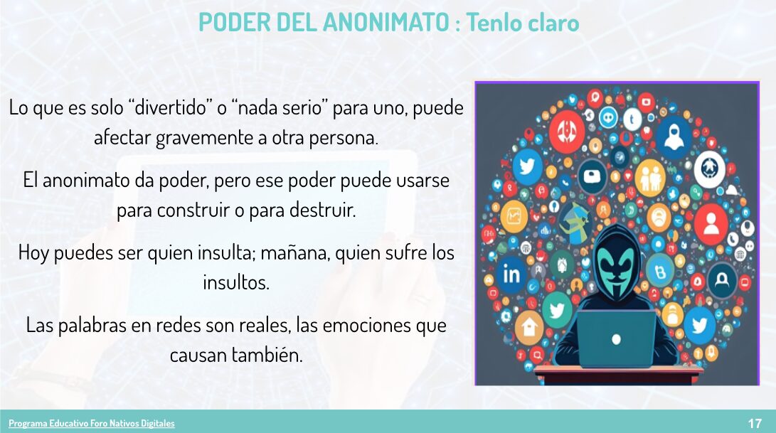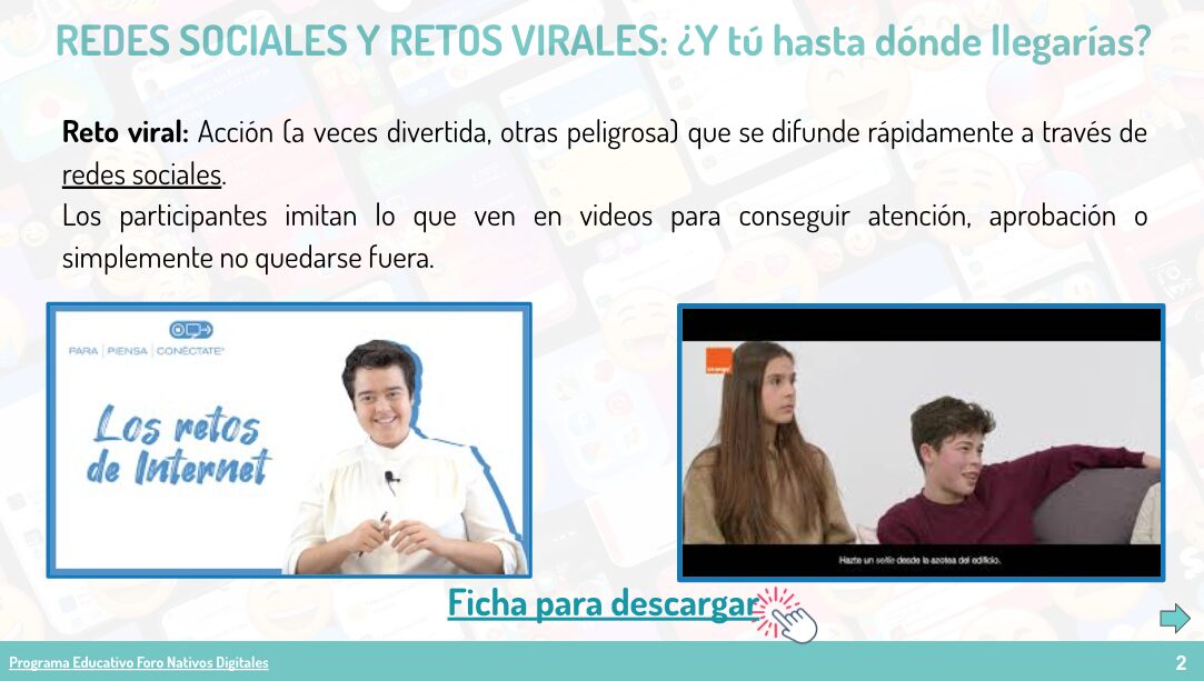 “Más allá de los likes. Cómo actuar frente a los desafíos en redes” es un material didáctico pensado para que, a través de algunos recursos visuales y debates, los alumnos entiendan lo que es la presión de grupo, con la que buscan sentirse aceptados por los demás, la búsqueda de aprobación (y fenómeno FOMO – Fear Of Missing Out) como deseo de destacar y no sentirse fuera de lo que “todos hacen” y el poder del anonimato, haciéndoles ver que la distancia que ofrecen las redes sociales reduce la percepción de riesgo ante lo que hacemos.